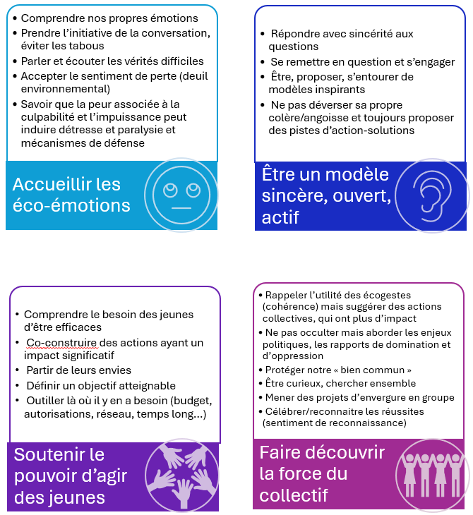 Les éco-émotions constituent ainsi un matériau éducatif central. La psychiatre Laélia Benoit propose des repères éducatifs dans « Parler ​du climat avec les adolescents »​ (accessible ici). Elle identifie 4 grandes intentions pour les éducateurs dans le document de synthèse suivant :